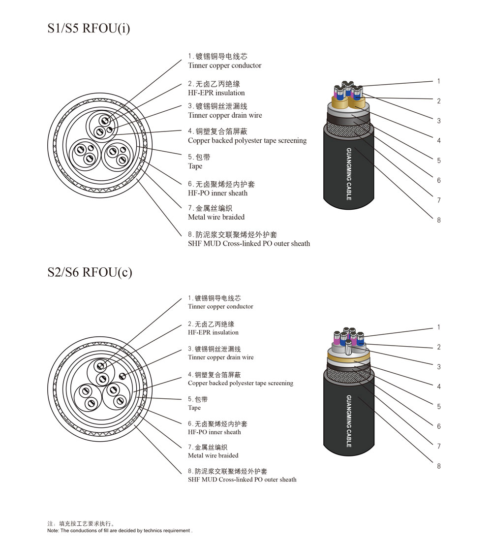 S2/S6 RFOU(c) | 无卤乙丙橡皮绝缘铜箔复合带整体屏蔽聚烯烃内包覆层镀锡铜丝编织铠装交联聚烯烃外套船用阻燃低压控制和仪表屏蔽防泥浆电缆 HF-EPR insulation Copper backed polyester tape Collectively screening PO inner covering tinned copper braided cross-linked PO outer sheath shipboard Flexible Flame retardant Low voltage Control and instrument Mud Resistant Cable | |